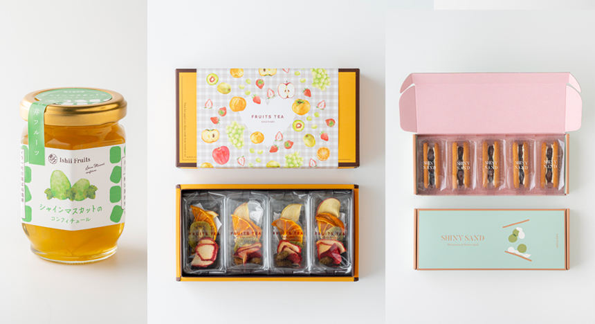 新鮮な果実を使ったさまざまな商品をお楽しみください。贈り物にもどうぞ。